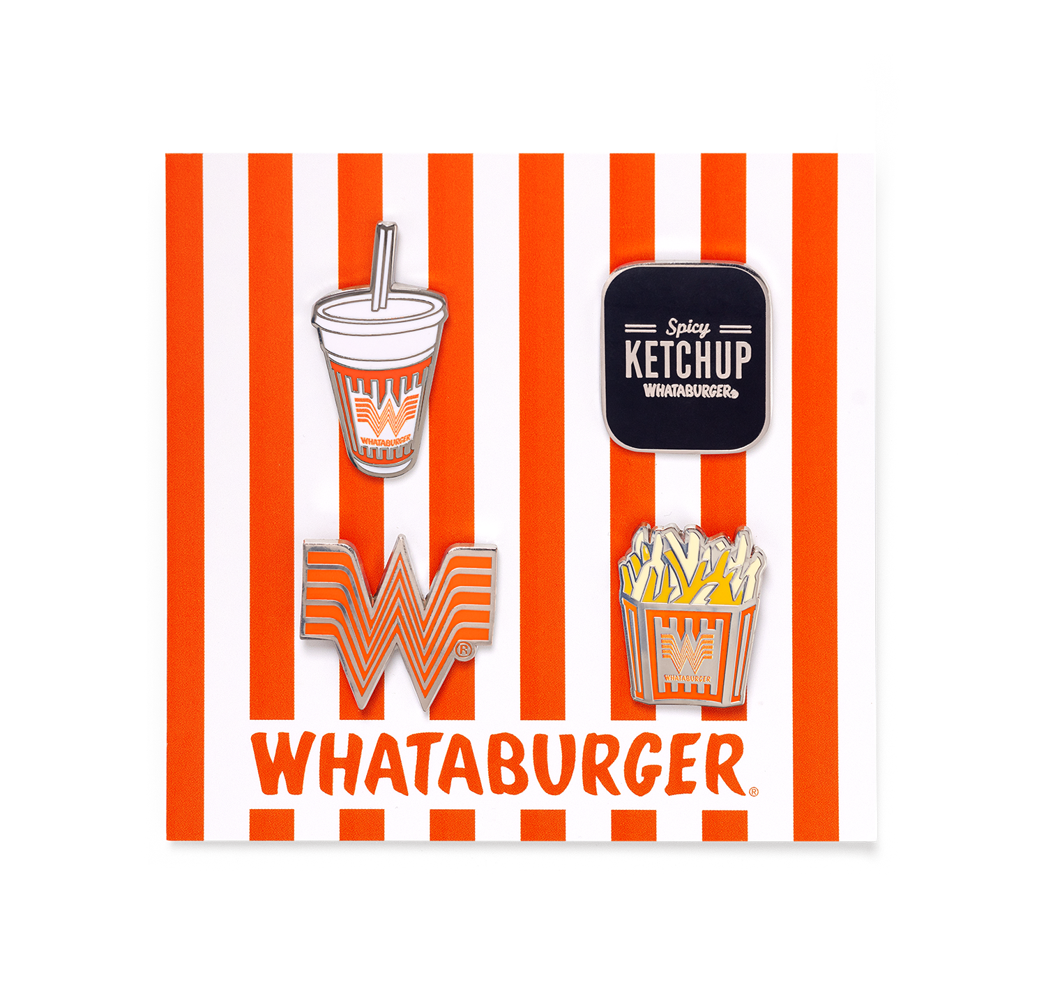 Show off your love for Whataburger with this set of 4 enamel pins! Featuring iconic Whataburger items like the Striped Cup, Spicy Ketchup, and Whataburger Fries, as well as the Flying W logo, this set is perfect for any true fan. Pin them on your backpack, jacket, or hat for some extra flair!