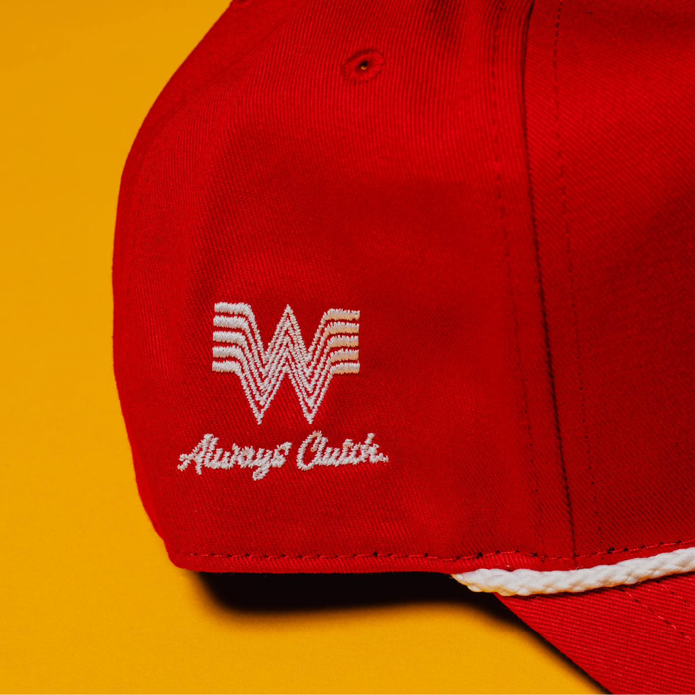 – Red 5-panel baseball hat with white rope detail