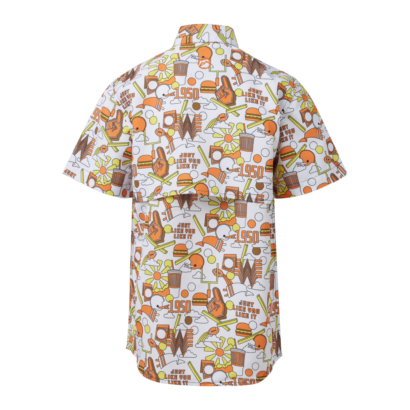 Liven up your clothing collection with the Magellan Outdoors x Whataburger Laguna Madre Happy Crazy Fun Short Sleeve Fishing Shirt. The polyester material is built for frequent use, and the relaxed fit gives you an easygoing wearing experience. The short sleeves keep you cool, and the button-down closure gives you a polished look.