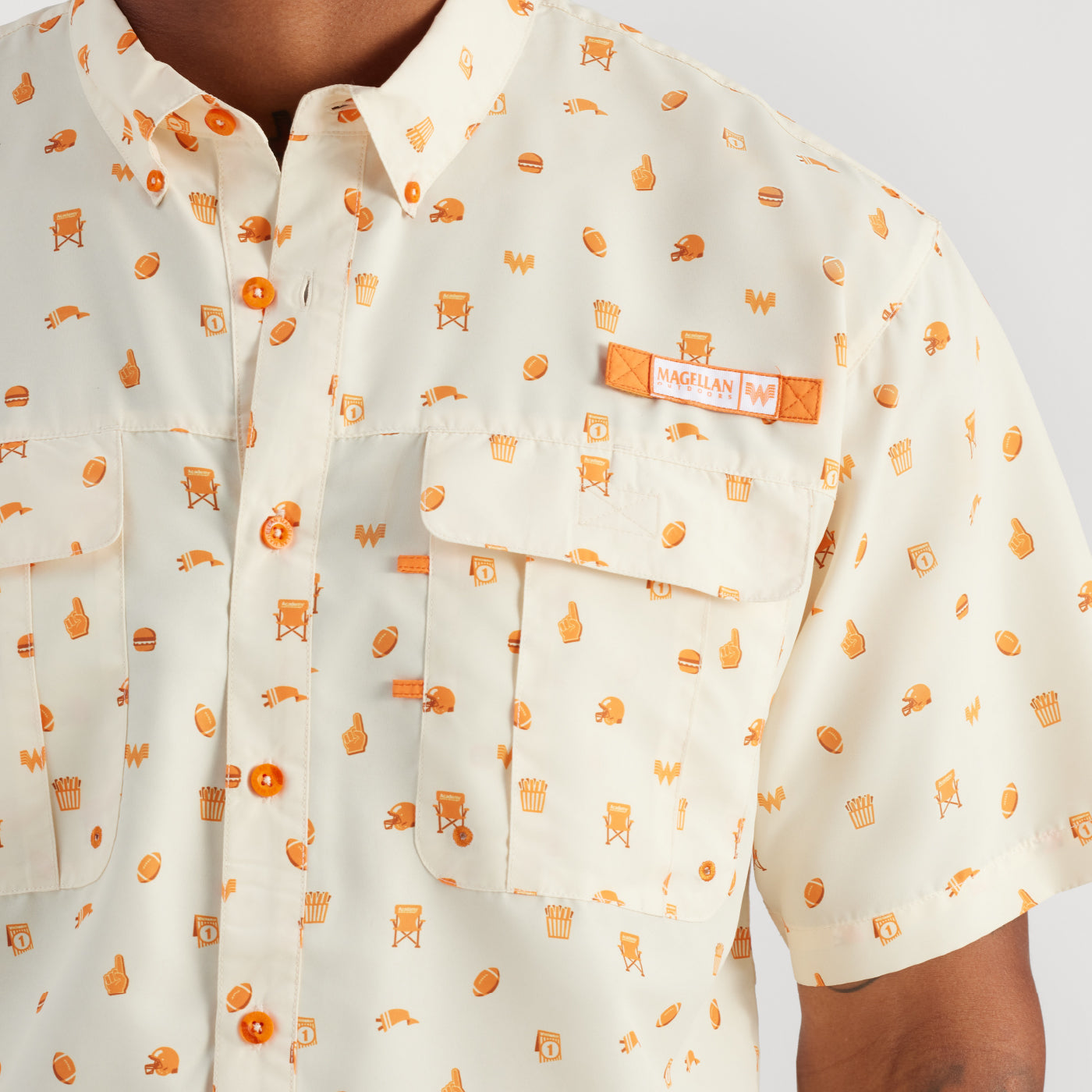 Upgrade your outdoor apparel collection with the Magellan Outdoors x Whataburger Laguna Madre Micro Pattern Short Sleeve Fishing Shirt. The button-down closure gives you a polished look, and the lightweight composition allows freedom of movement. The ventilation provides the shirt airflow, and the UPF protection offers peace of mind while spending time outside.