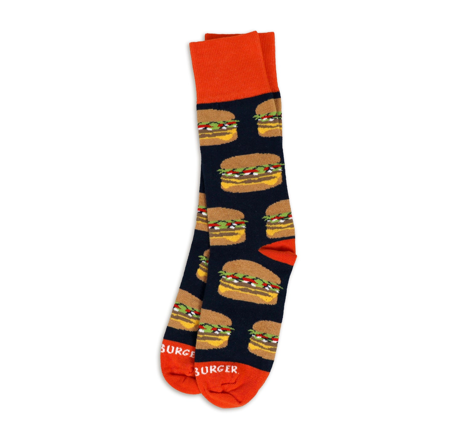 The #1 burger is now your #1 pair of socks! Add some flavor to your wardrobe with our Navy Burger Build Socks. With a unique design featuring repeating Whataburgers, these navy and orange dress socks are perfect for the burger lover in your life. Grab a pair and step up your sock game!