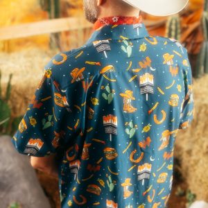 Get ready to rustle up some style with our Navy Collage Snap Shirt. Featuring whimsical assorted illustrated Whataburger graphics, including a pole sign, burger, horse shoe, boots, and fries, this shirt is sure to make a bold statement. Snap it up before it’s gone!