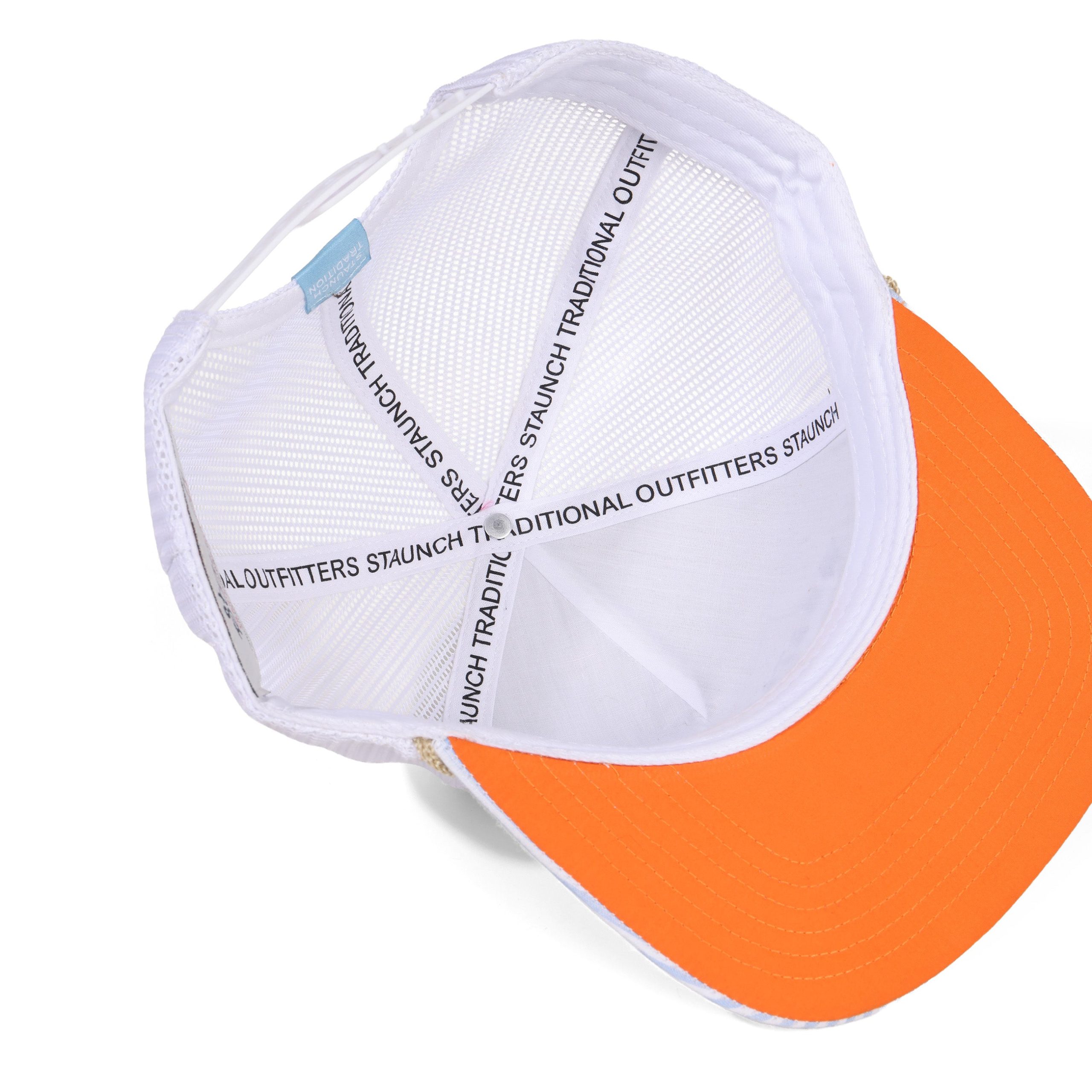 This playful Seersucker Staunch Collection Hat features a crisp white front paired with a classic seersucker top bill accented by a tan rope detail. The vibrant orange bottom bill adds a pop of color, while simple Whataburger logos embroidered on the front keep it stylishly understated. Perfect for adding a fun twist to your casual look!