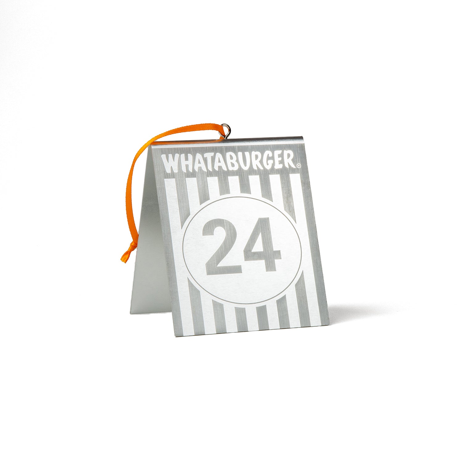 Spruce up your holiday décor with our Whataburger Table Tent Ornament! Made of silver with a festive orange ribbon, this quirky ornament reads “Merry Christmas” on one side and “24” on the other. Perfect for any Whataburger fan.