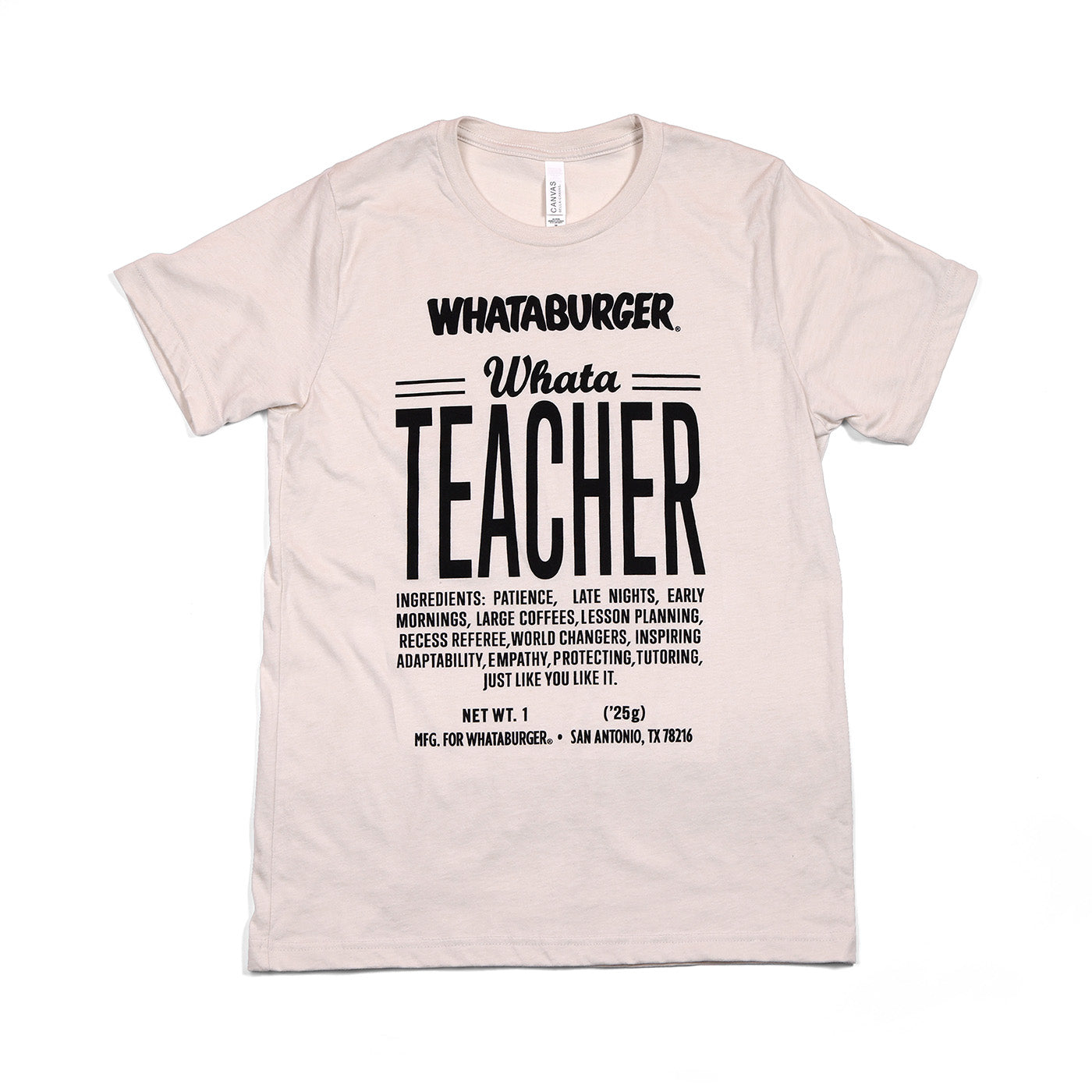 Get ready to show off your love for your favorite educator with our WhataTeacher Ingredient Tee! Inspired by the iconic Whataburger ketchup label, this cream colored tee lists the essential qualities of a great teacher – like patience, early mornings, and lesson planning. Perfect gift for any teacher!