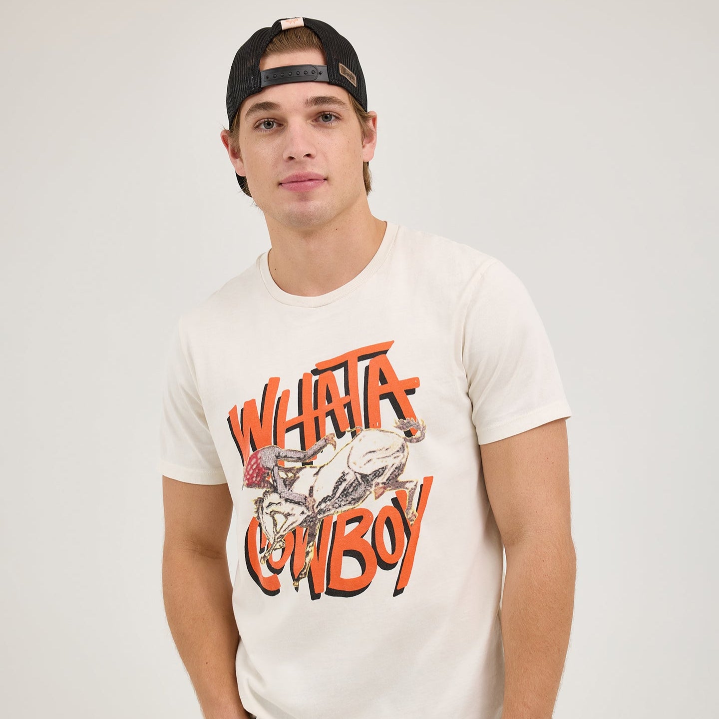 After the rodeo, every cowboy needs a burger, fries, and a milkshake to fill his tank. Luckily, this Wrangler® x Whataburger® Men’s Cowboy Graphic T-Shirt serves it fresh right off the grill, just like you like it. This classic crewneck tee is crafted from cotton for nonstop comfort. It features a retro-inspired graphic print across the front of a bronc rider in action and a list of fan favorites across the back in true Texas style.
