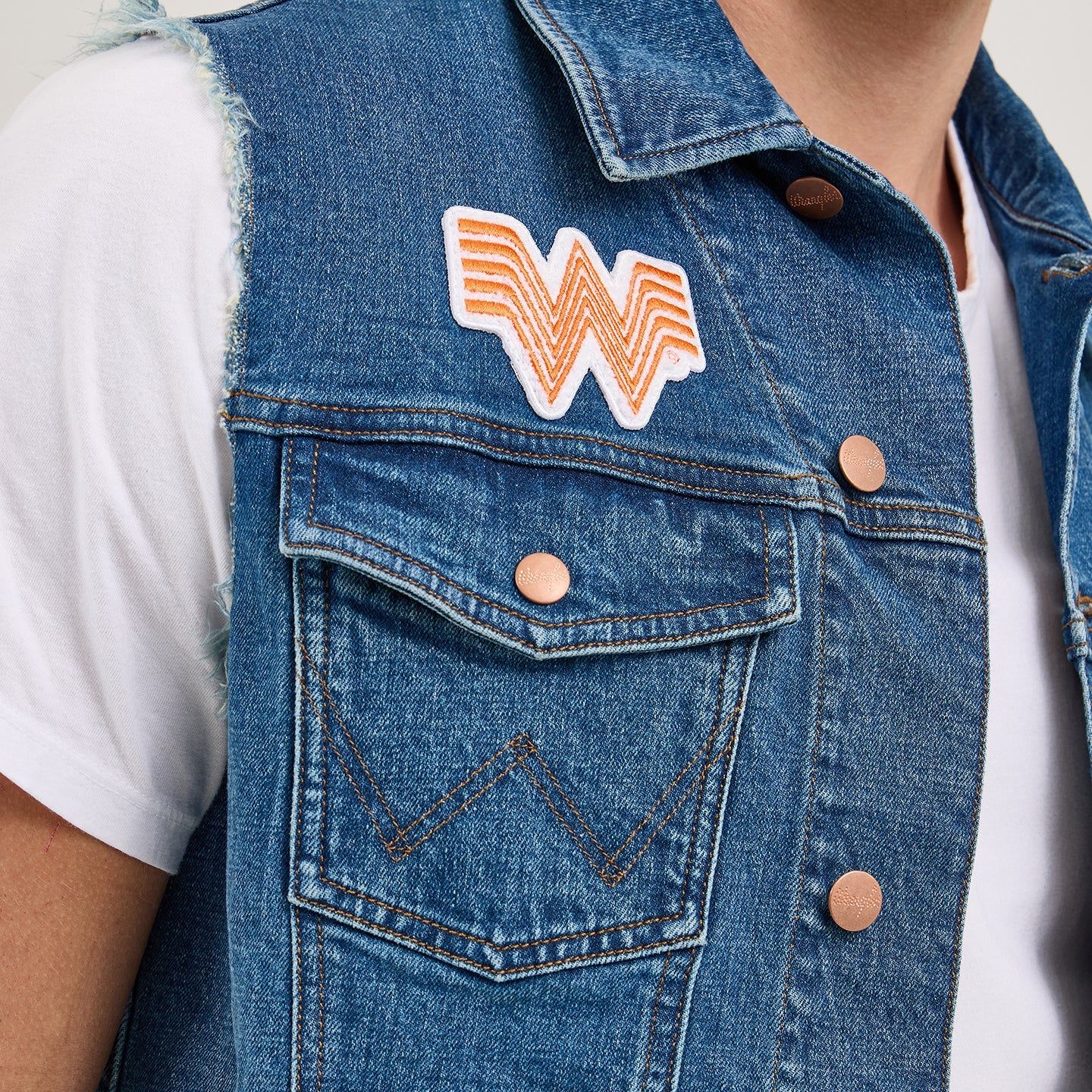 What’s better than a combo? Easy, a Texas-sized collaboration. The Wrangler® x Whataburger® Cut-Off Vest offers a fresh denim look right off the grill with all the fixings of your favorite food spot. Not too tight or too loose, it comes with a regular fit that’s great for layering. It also has the signature chest pockets with our ‘W’ stitching, bright copper hardware, and an assortment of retro-inspired patches nodding to the rich history of each brand.