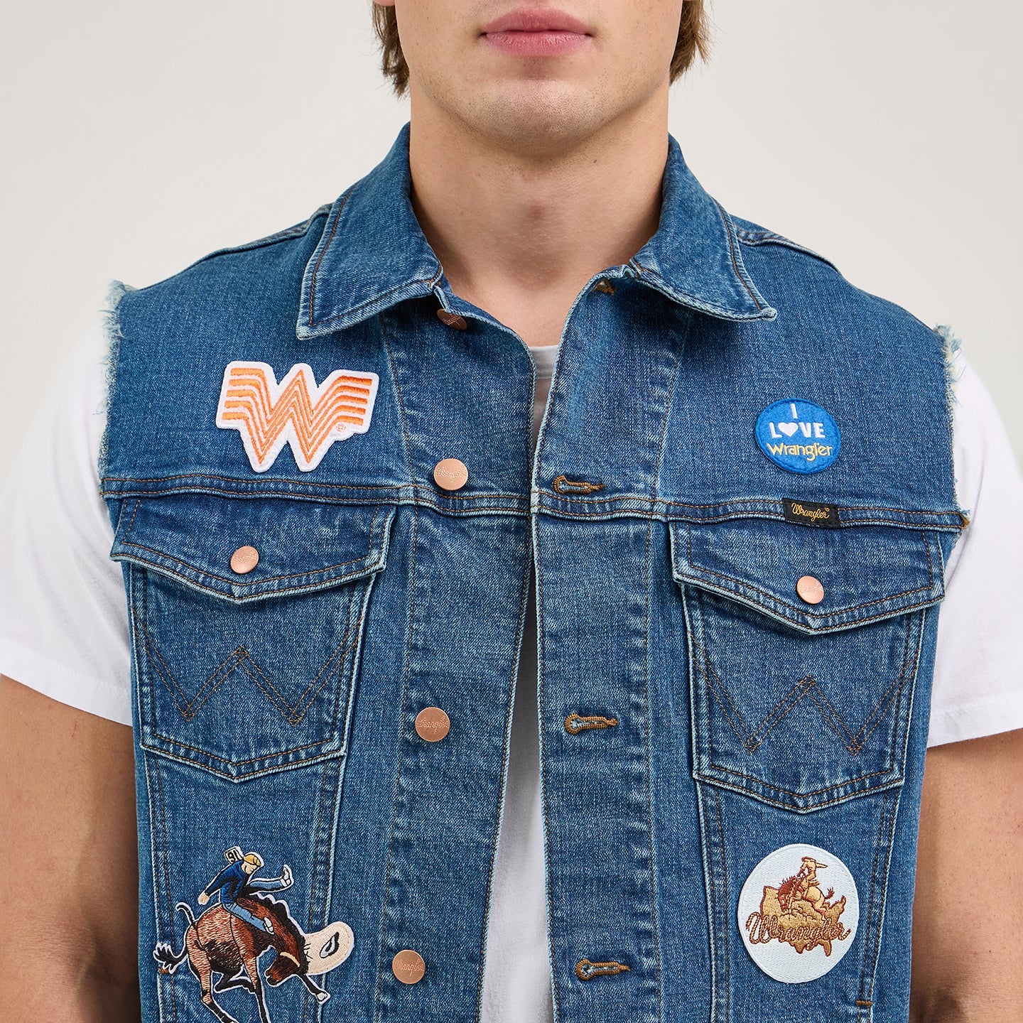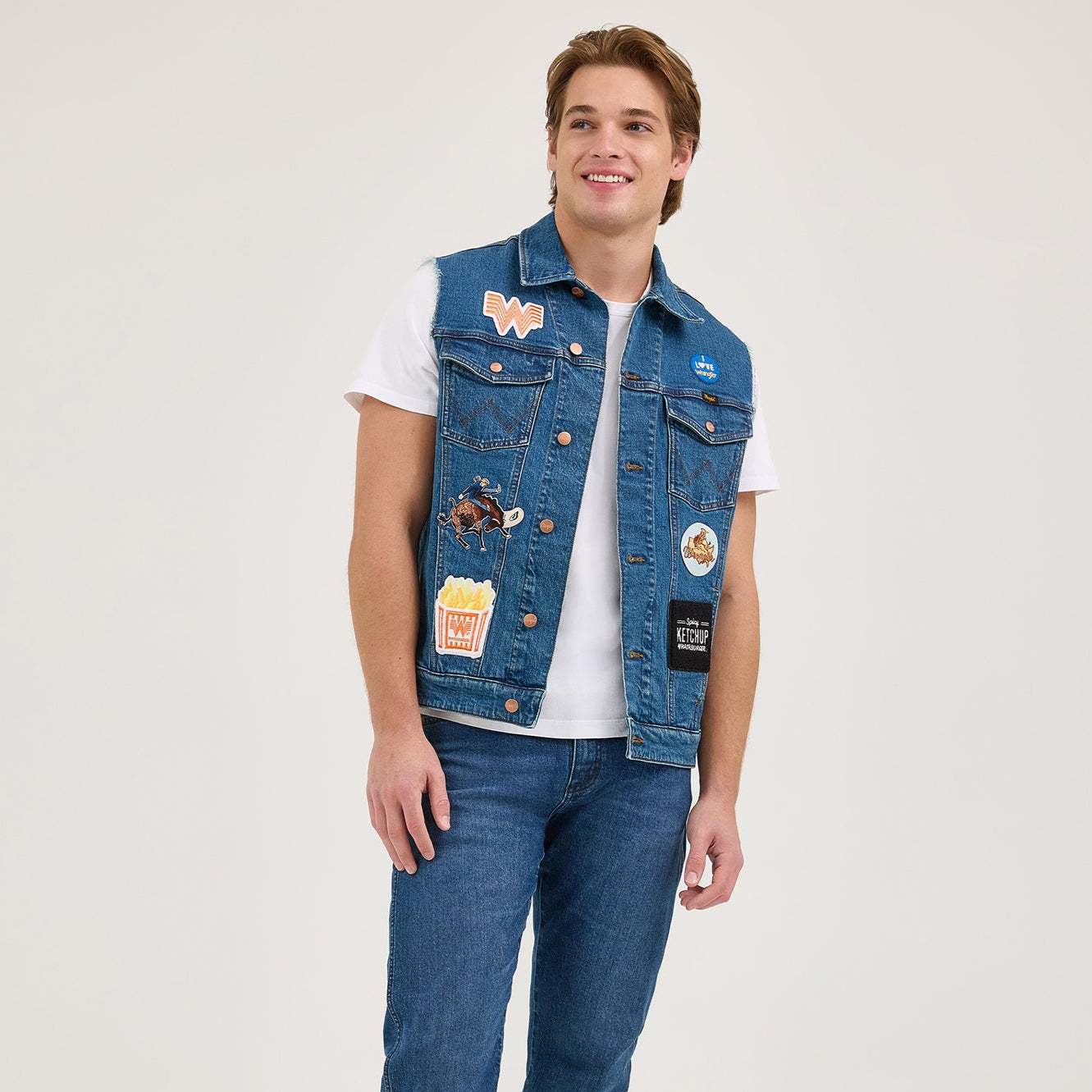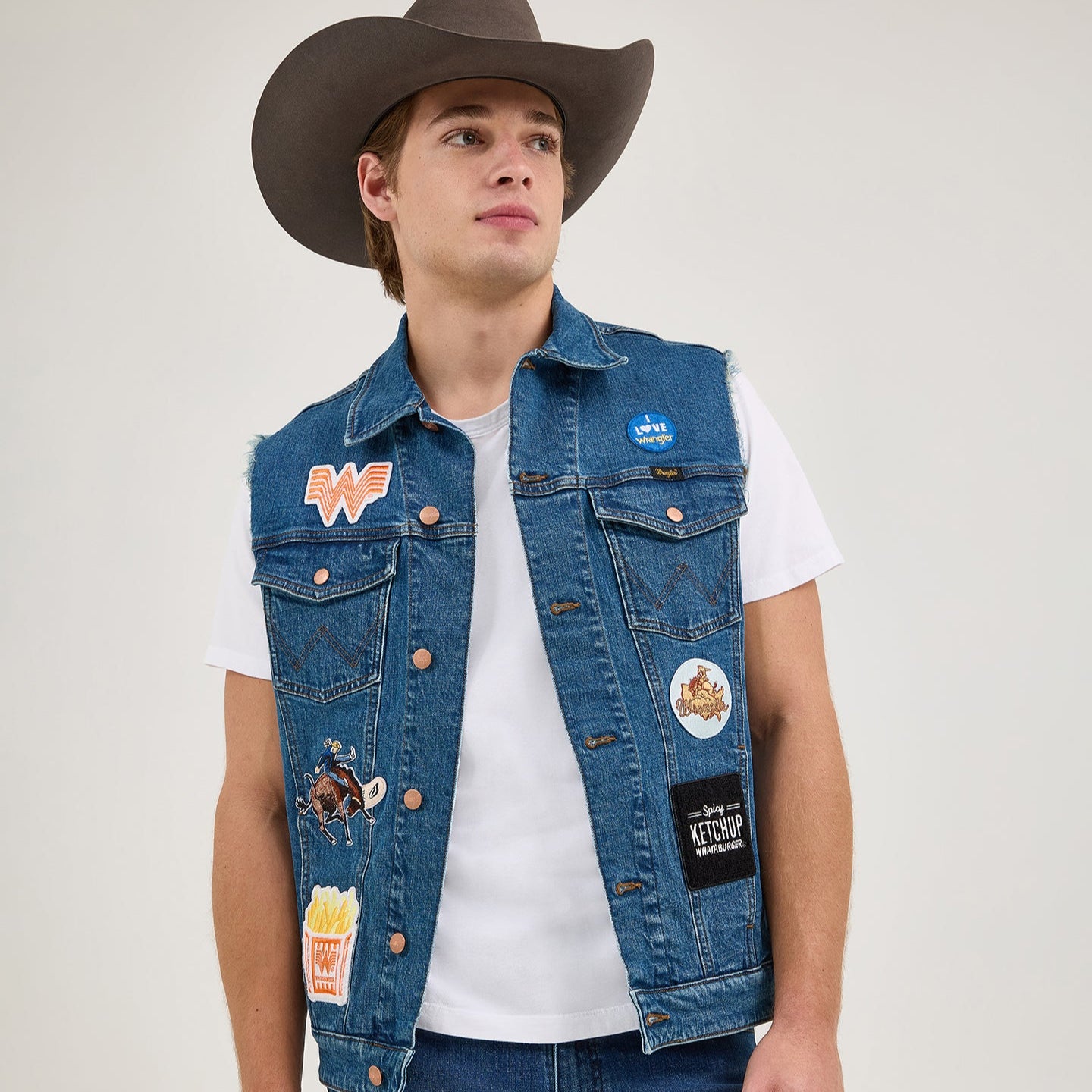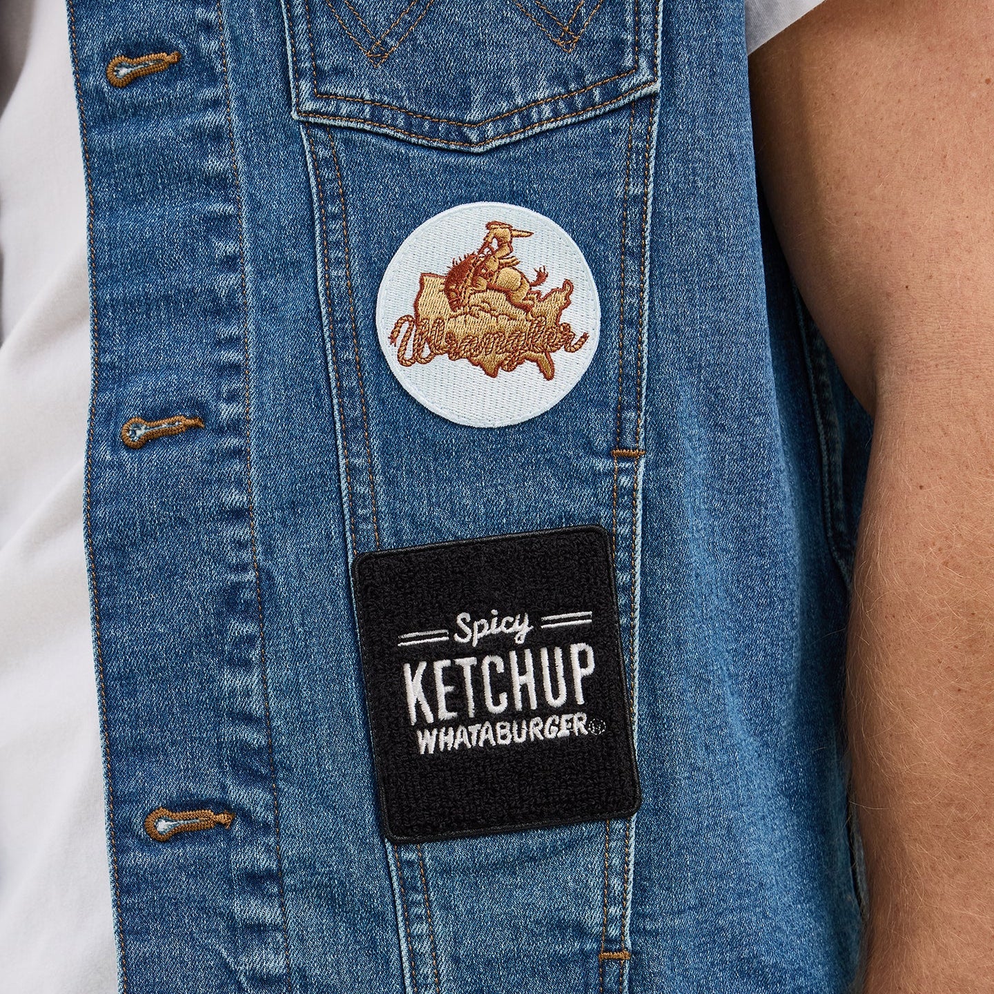 What’s better than a combo? Easy, a Texas-sized collaboration. The Wrangler® x Whataburger® Cut-Off Vest offers a fresh denim look right off the grill with all the fixings of your favorite food spot. Not too tight or too loose, it comes with a regular fit that’s great for layering. It also has the signature chest pockets with our ‘W’ stitching, bright copper hardware, and an assortment of retro-inspired patches nodding to the rich history of each brand.