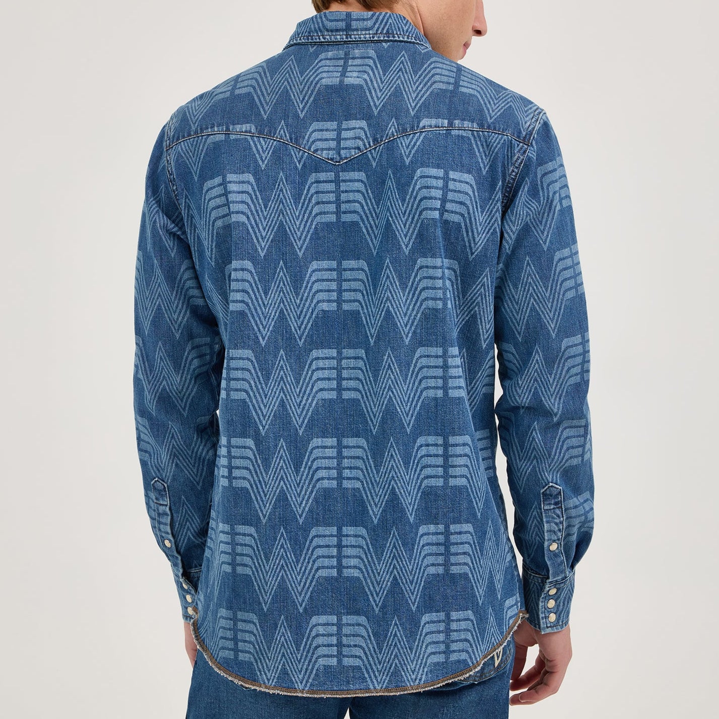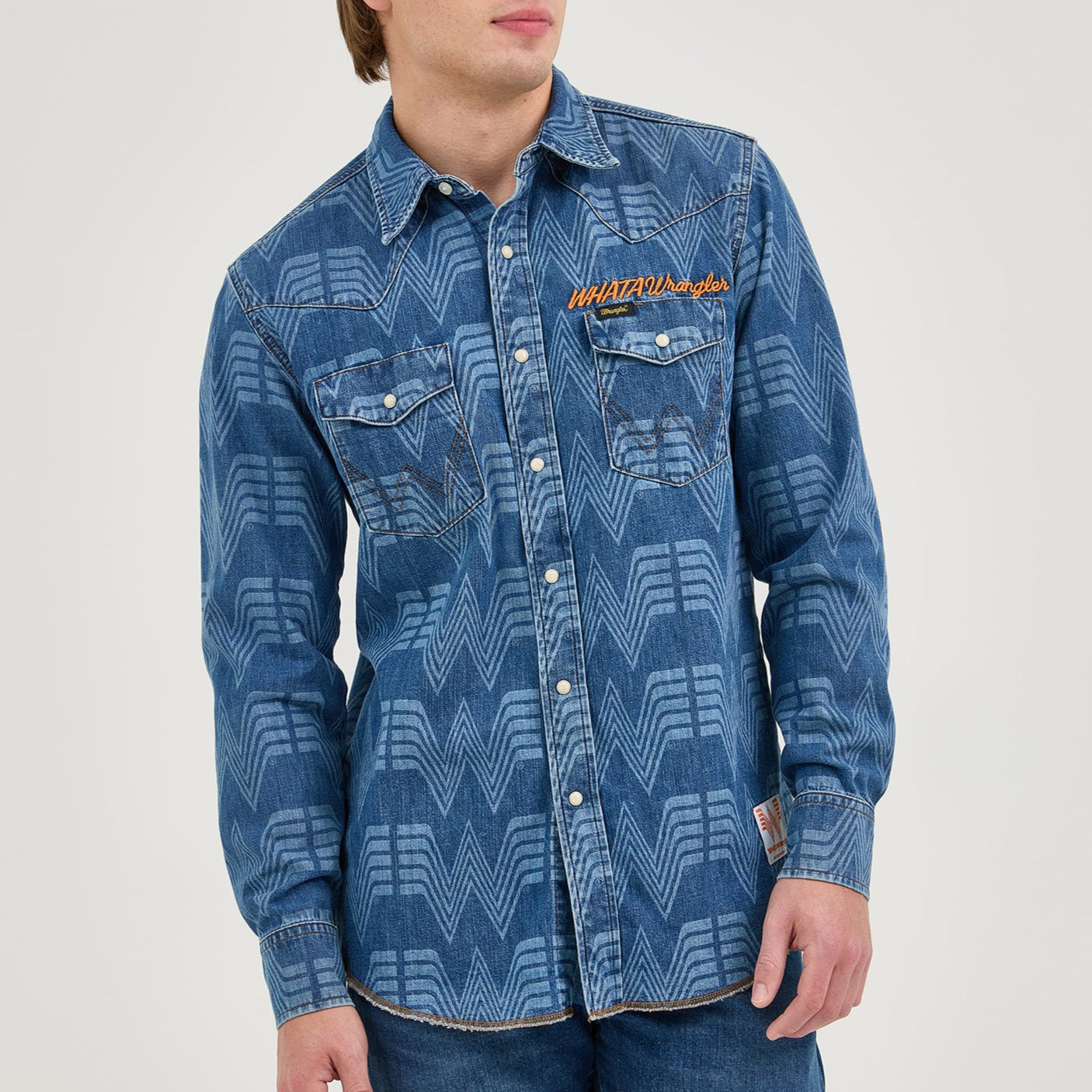 You’ve got great taste—in denim and in burgers. The Wrangler® x Whataburger® Western Print Shirt gives you the best of both worlds in one iconic style that’s ready for rodeo nights and late drive-thru runs. It’s crafted from 100% cotton in a medium blue wash with a lasered “flying W” print from front to back that’ll give you a two-toned look. This classic collared shirt comes with the signature pearl snaps and chest flap pockets with ‘W’ stitching as well as an embroidered collaboration logo below the yoke and a woven label at the hem.