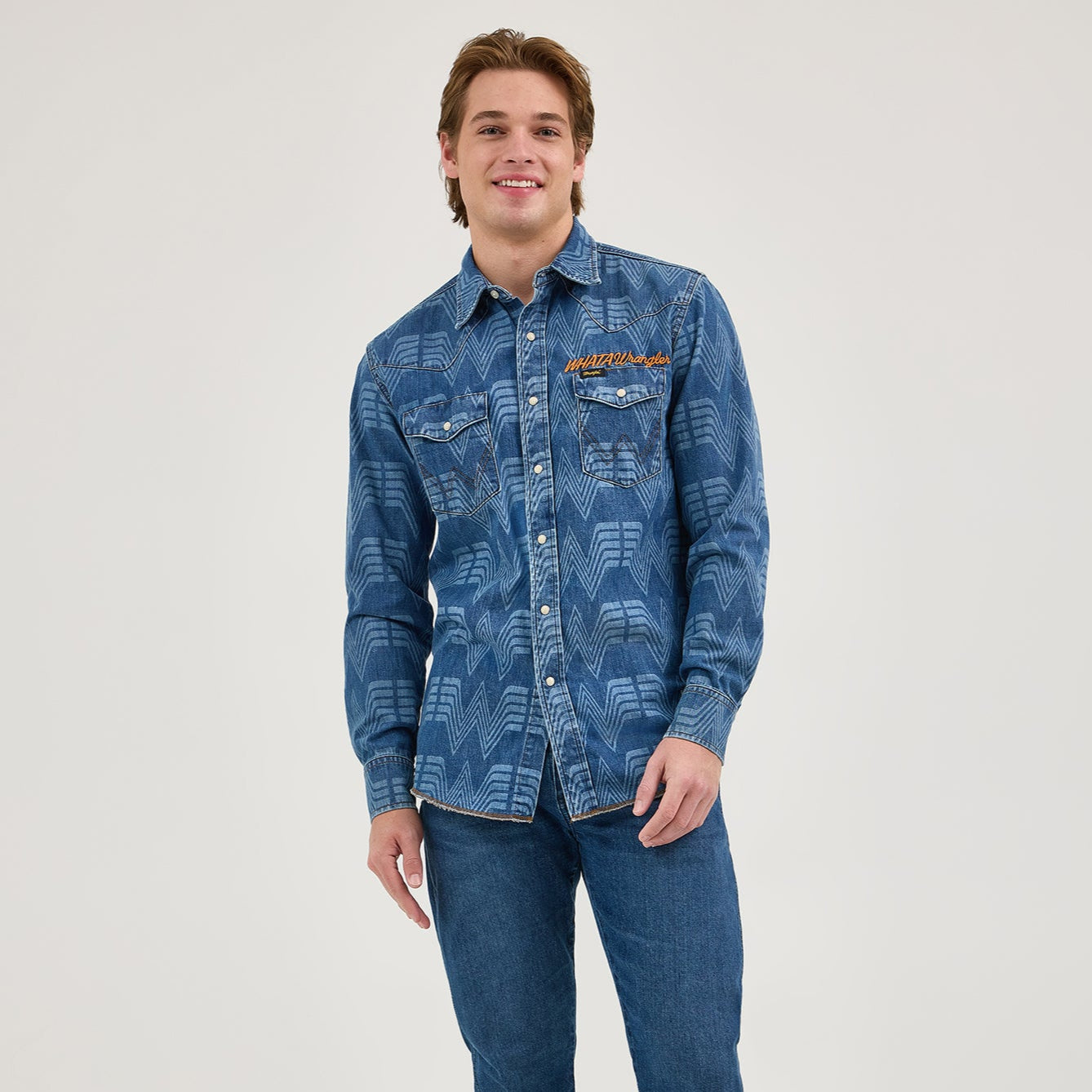 You’ve got great taste—in denim and in burgers. The Wrangler® x Whataburger® Western Print Shirt gives you the best of both worlds in one iconic style that’s ready for rodeo nights and late drive-thru runs. It’s crafted from 100% cotton in a medium blue wash with a lasered “flying W” print from front to back that’ll give you a two-toned look. This classic collared shirt comes with the signature pearl snaps and chest flap pockets with ‘W’ stitching as well as an embroidered collaboration logo below the yoke and a woven label at the hem.